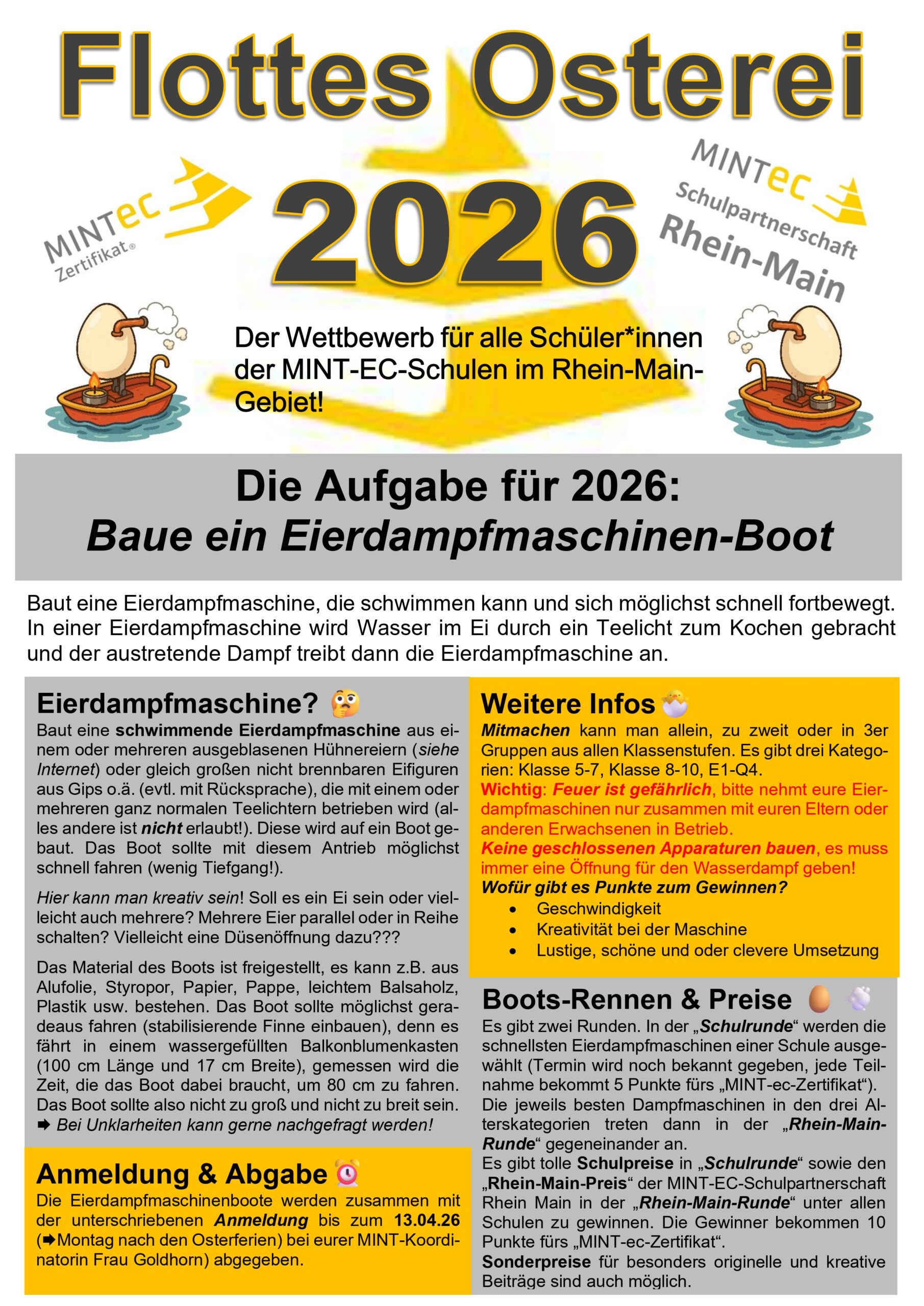 Die “Flotte Wettbewerbsserie” geht in die 6. Runde 🙂 In diesem Jahr geht es darum, eine möglichst schnell schwimmende Eierdampfmaschine zu bauen. Hierbei wird Wasser in einem ausgeblasenen Ei durch ein Teelicht zum Kochen gebracht und der austretende Dampf treibt die Eierdampfmaschine an.