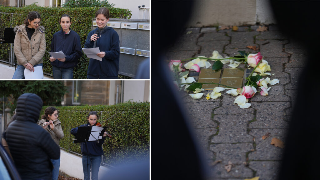 Die Levis, die Eltern Julius und Bella sowie die Kinder Curt und Liesel, mussten in Frankfurt die Brutalität der antisemitischen Diskriminierung erdulden, auch ihr Haus in der Hammanstraße 27 wurde enteignet. Doch ihnen gelang in die Flucht in die USA. Seit heute erinnert ein Stolperstein an jener Stelle – ihrer letzten freiwilligen Adresse vor der Flucht – an das Schicksal der Levis. Die Zeremonie wurde mitgestaltet von unseren Schülerinnen Ann Sophie Bechstein (10e), Jasmin Blauhut und Flora Imbescheidt (beide E-Phase), die die Biographie der Levis und unsere Forschungsergebnisse verlasen. Jasmin und Flora begleiteten die Enthüllung der Stolpersteine auch musikalisch und rundeten damit eine würdevolle Veranstaltung ab.